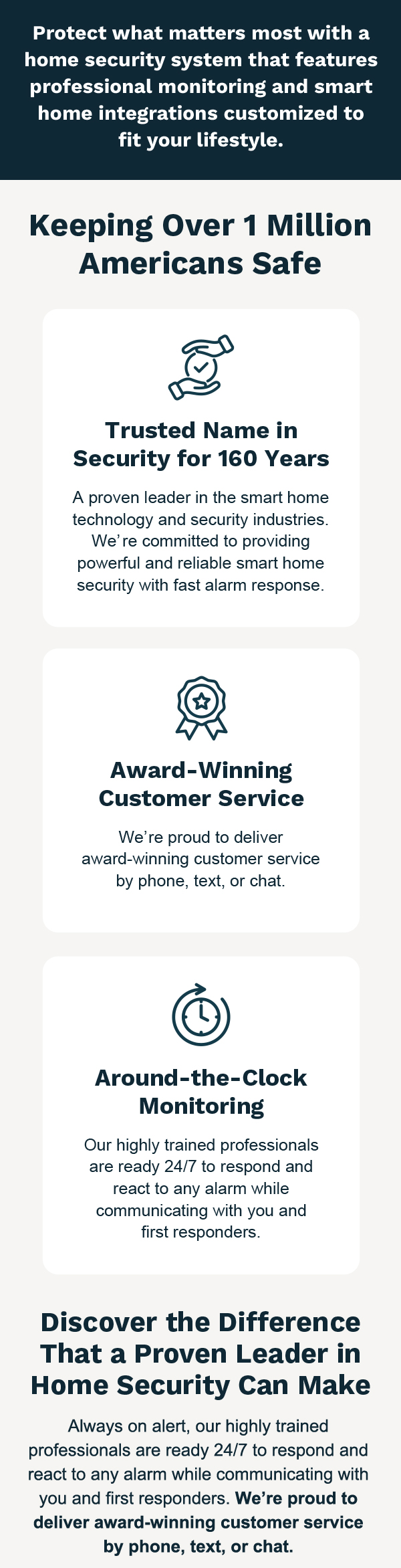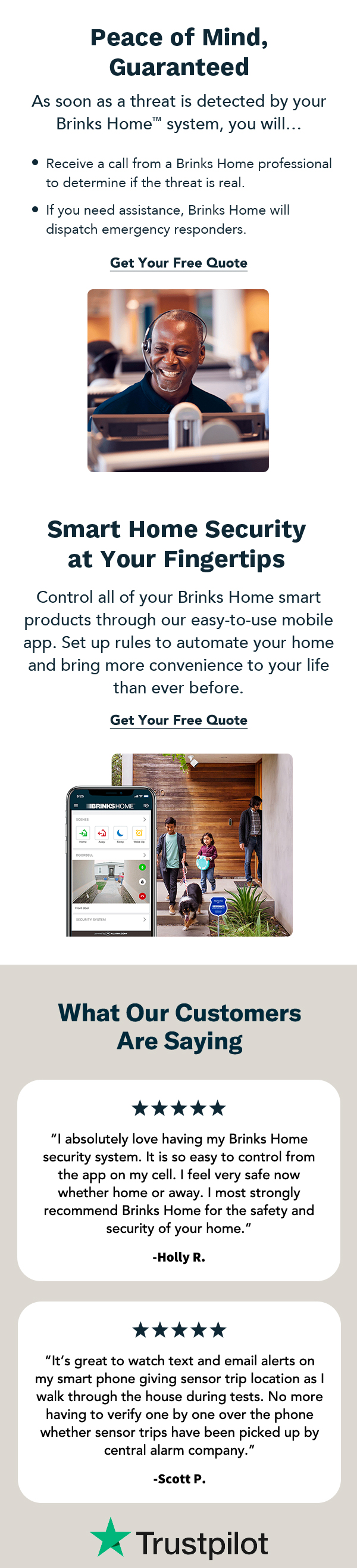 By clicking the "Get Your Free Quote” button below, you agree that Brinks Home may contact you at the phone number and/or email address provided by you via phone calls, text messages, and/or emails, using automated technology, for sales/marketing purposes or any other informational purposes. Your information is collected and used in accordance with our Privacy Policy. Your consent is not required to purchase any products or services. Clicking the button below constitutes your electronic signature.
