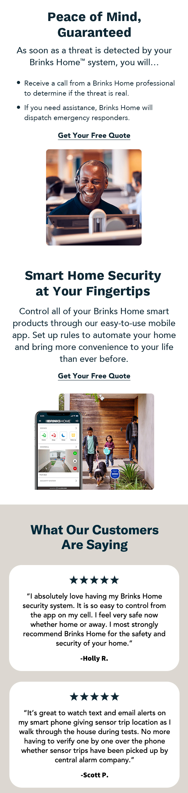 "I absolutely love having my Brinks Home security system. It is so easy to control from the app on my cell. I feel very safe now whether home or away. I most strongly recommend Brinks Home for the safety and security of your home."